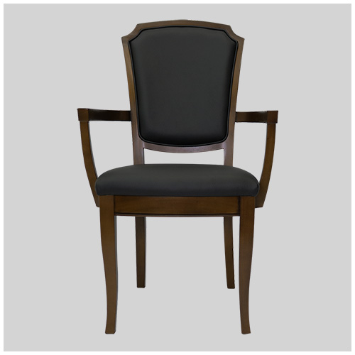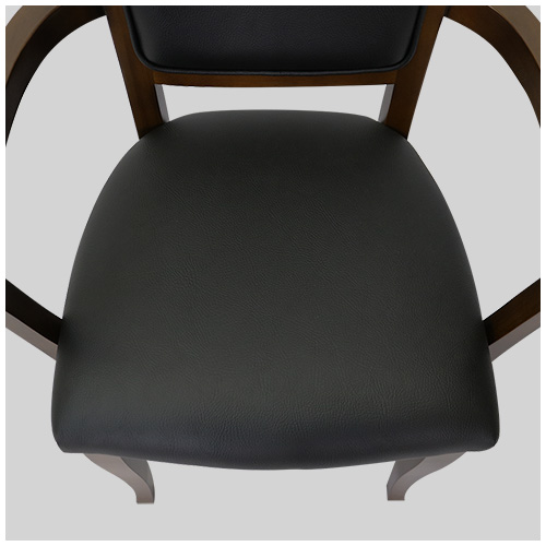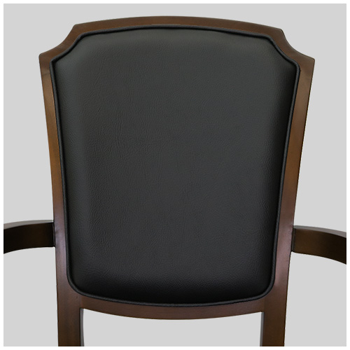 マホガニー材のフレームと優しく背をサポートする、ミドルハイバックのネオクラシカル調のデザイン。座はウレタンフォームにS バネとウェービングの構造で、弾力のあるしなやかな座り心地。座面と背にお手入れし易い黒の合成皮革(PVC)を張った、重厚感のあるアームチェアです。